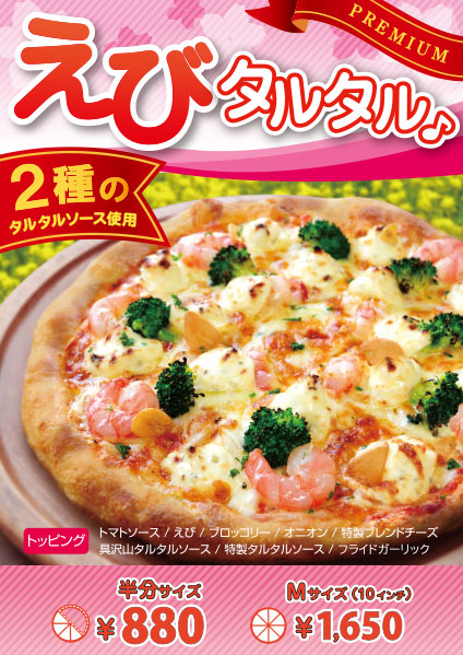 トマトソース・えび・ブロッコリー・オニオン・特製ブレンドチーズ・具沢山タルタルソース・特製タルタルソース・フライドガーリック