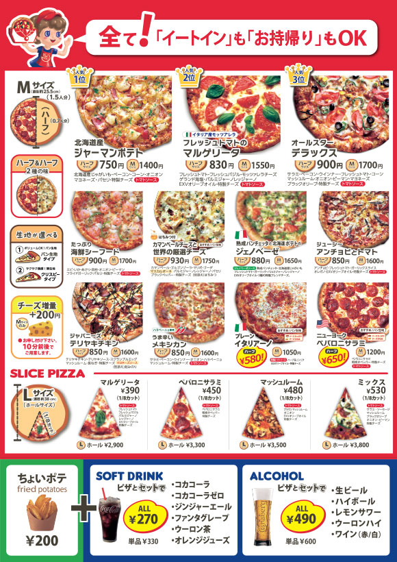 手作りのお待ち帰りピザは、みんなでシェアして食べれるMサイズ、お一人様からでも楽しめるハーフサイズ、2種類の大きさでご用意してます。